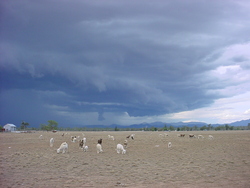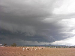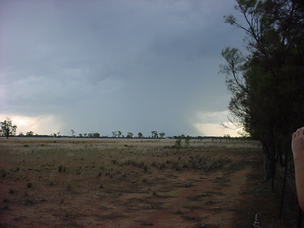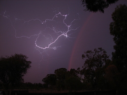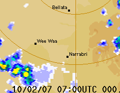There were many active storms around Narrabri during the period although only no more than about 20mm of rainfall was recorded on the network of local weather stations throughout the period. Some people out of town reported heavier rainfall. The first widespread rain occurred on Saturday the 10th when a line of electrically active cells moved in from the west. The RADAR loop to the right (courtesy of the Bureau of Meterology) shows this event. The lightning detector at the Australia Telescope peaked at about 1200 strikes within 56km over a 15 minute interval. The photo sequence left shows a lightning strike from the Culgoora webcam. Monday the 12th saw some very heavy rainfall just North of Narrabri. This was associated with a squall line that at one stage went all the way from Rowena to Stanthorpe. The Myall Vale weather station recorded 15mm in an hour on this day. |