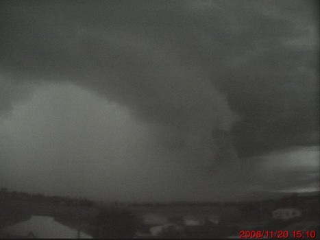 The second noteworthy storm, around 15:10, dropped significant amounts of hail up to about 1cm diameter at the Kaputar Rd station and perhaps the Airport. This took Kaputar Rd to a total of 31mm and the Airport to 22mm. It shows up great on the webcam movie because the storm slipped just east of town, directly across the camera's field of view. On the RADAR this event seemed to involve the interaction between a storm moving roughly SE and another moving NE, which merged right above the weather stations.