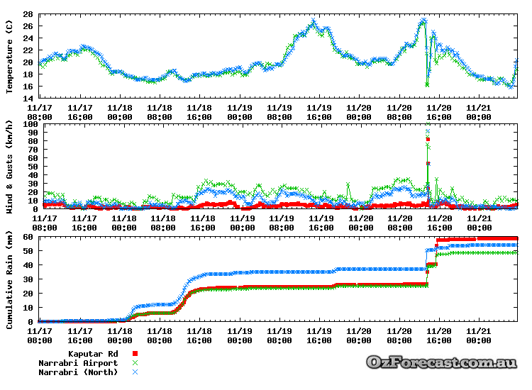 These three stations recorded the highest wind gusts measured in NSW on the 20th thanks to this storm. Other gusts in the Shire from this initial storm included 71km/h at Narrabri (Village) between 13:15 and 13:30, 77km/h at Cardale/Mollee at 13:15 and 69km/h at Merah North at 12:45.