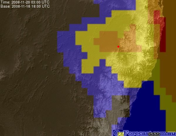 Next is a chart of NSW showing the Convective Available Potential Energy (CAPE) predicted by the GFS weather model for 2pm (sorry no scale). CAPE is a measure of the energy available to drive the updrafts which power storms. The red dot indicates Narrabri's position:
