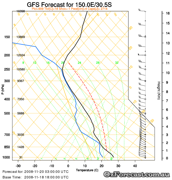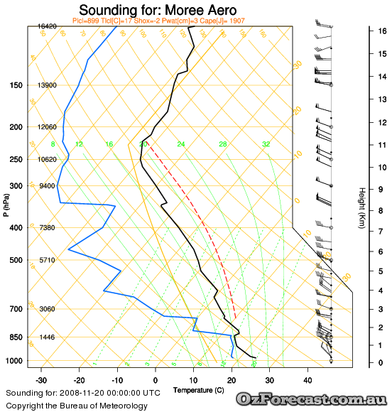 The Moree sounding shows the day started with relatively clear skies, while the forecast shows deep layers of cloud are present by afternoon. Both soundings show that the atmosphere is quite unstable and that strong winds are present in the upper atmosphere which helps severe weather to develop. Look here for a good tutorial on reading these diagrams.