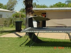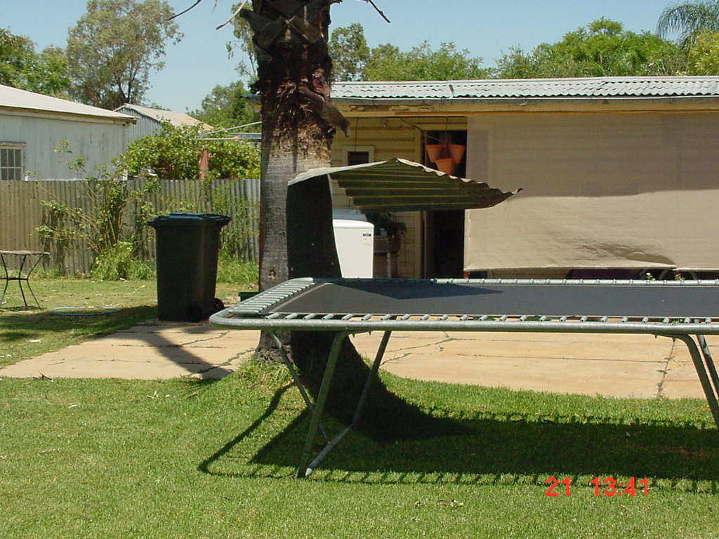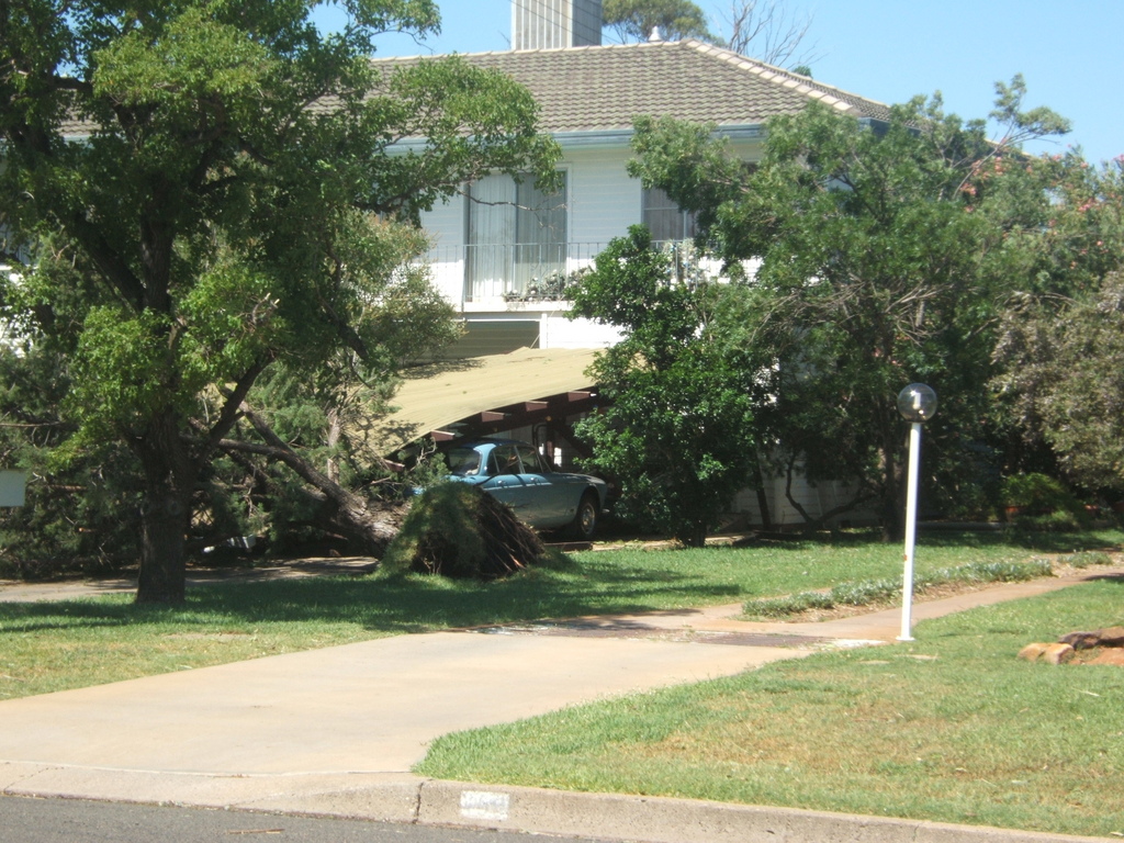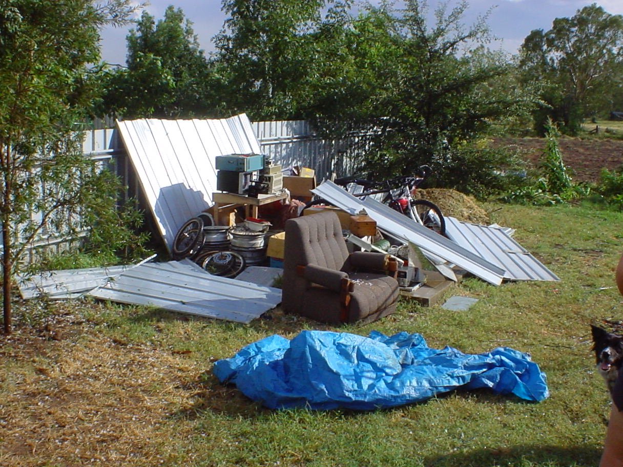 | Dozen's of garden shed's around town were destroyed. This was my shed on Old Gunnedah Rd. Its roof ended up in the neighbours back yard! Photo by David Brodrick. | Whoa! This sheet of corrigated iron got stuck in this tree right at take-your-head-off height!! Photo by Ed Paas. | ||