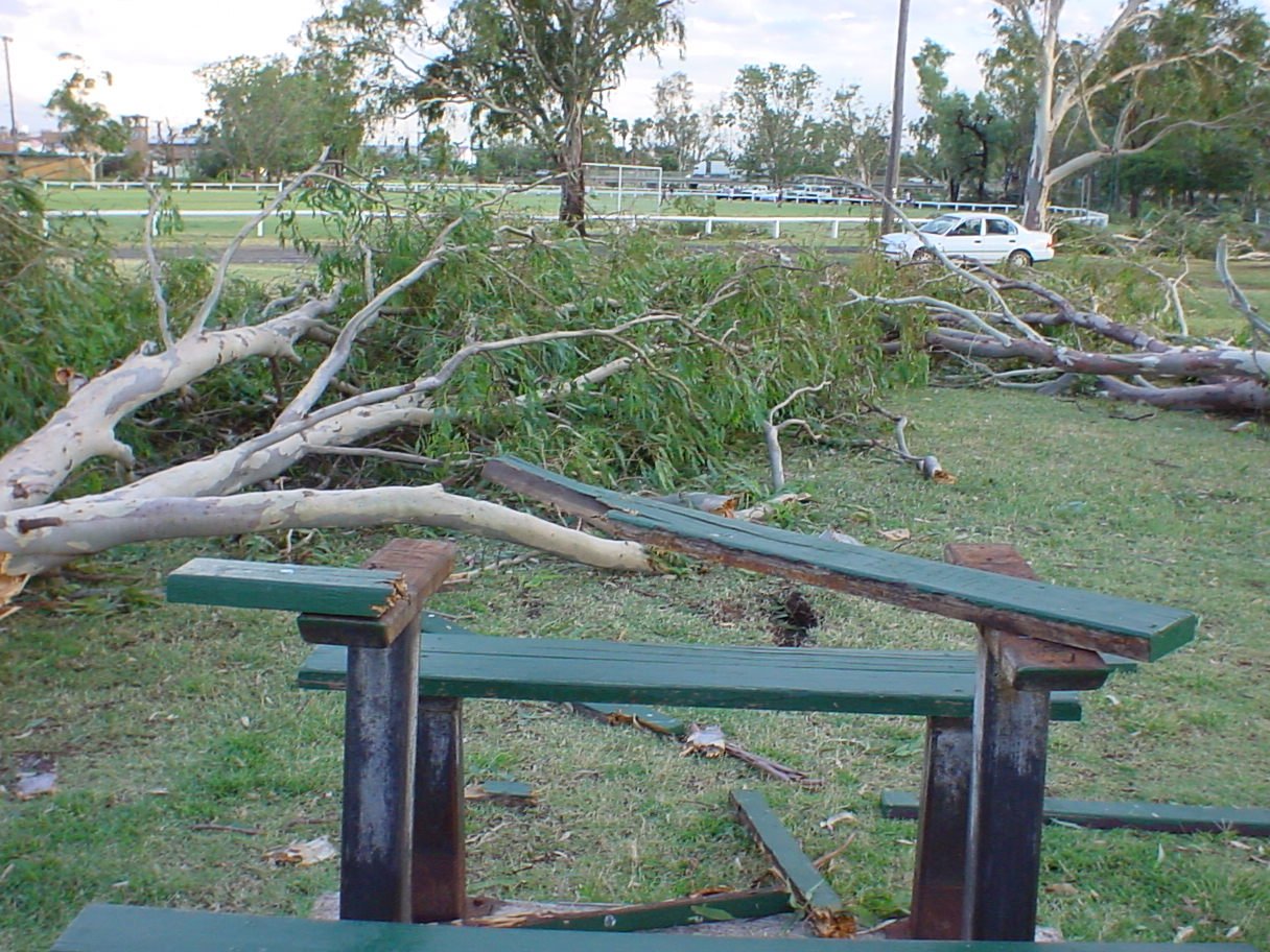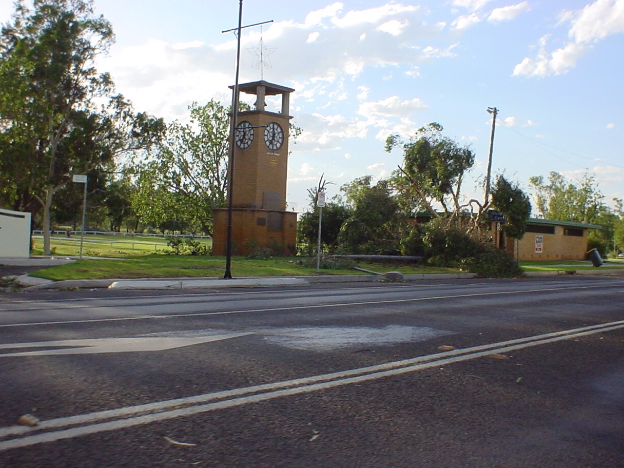 The damage was quite widespread in Narrabri, with the most intense destruction occurring in the North of town, eg around the Golf Club and Doctors Creek bridge areas. The storm also made itself felt out of town - the Myall Vale (between Narrabri and Wee Waa on the Kamilaroi Hwy) weather station recorded an 80km/h gust, with shadehouses and powerlines brought down there. There was damage on properties around the Airport, with the BoM's weather station at the Airport(?) recording 156 km/h gusts - one of the highest wind speeds ever recorded in NSW! Large trees were also smashed where the storm crossed the Kaputar Rd near Haire Drive. The strong winds clearly persisted along a ground track of at least 30km. This RADAR loop from the Bureau of Meteorology shows the storm. |