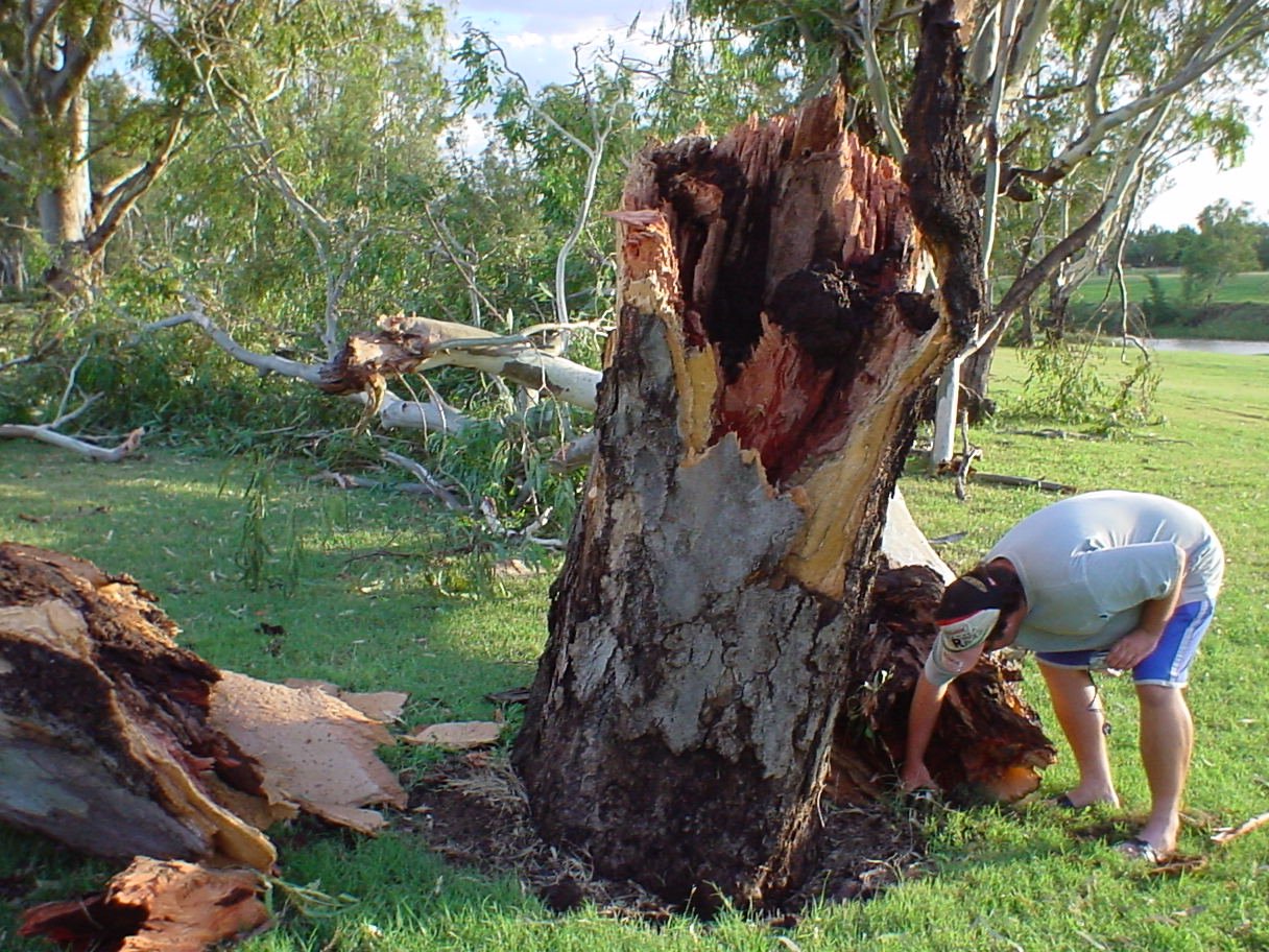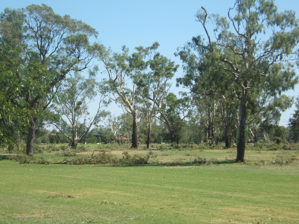 | This big old river red gum snapped a few metres above the ground. Taken on the river behind the Crossing Theatre. Photo by David Brodrick. | Different tree down, also behind the theatre/ovals. Photo by David Brodrick. | ||