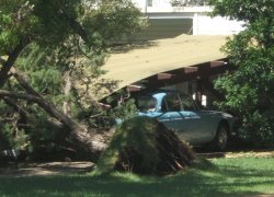 | Looks like a stressful day for the owner of this classic Jaguar on Gibbon's St.. although from the look of the photo it escaped with very little damage(?). Photo by Kieran Shephard. | Branches down at the Golf Club. Photo by Kieran Shephard. | ||
